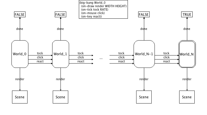 The big-bang function installs World_0 as the initial world; the callbacks tock, react, and click transform one world into another one; done checks each time whether the world is final; and draw renders each world as a scene.