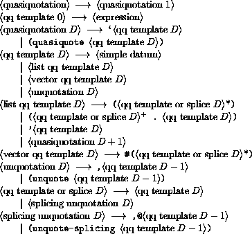 In <quasiquotation>s, a <list qq template D> can sometimes be confused with either an <unquotation D> or a <splicing unquotation D>. The interpretation as an <unquotation> or <splicing unquotation D> takes precedence.